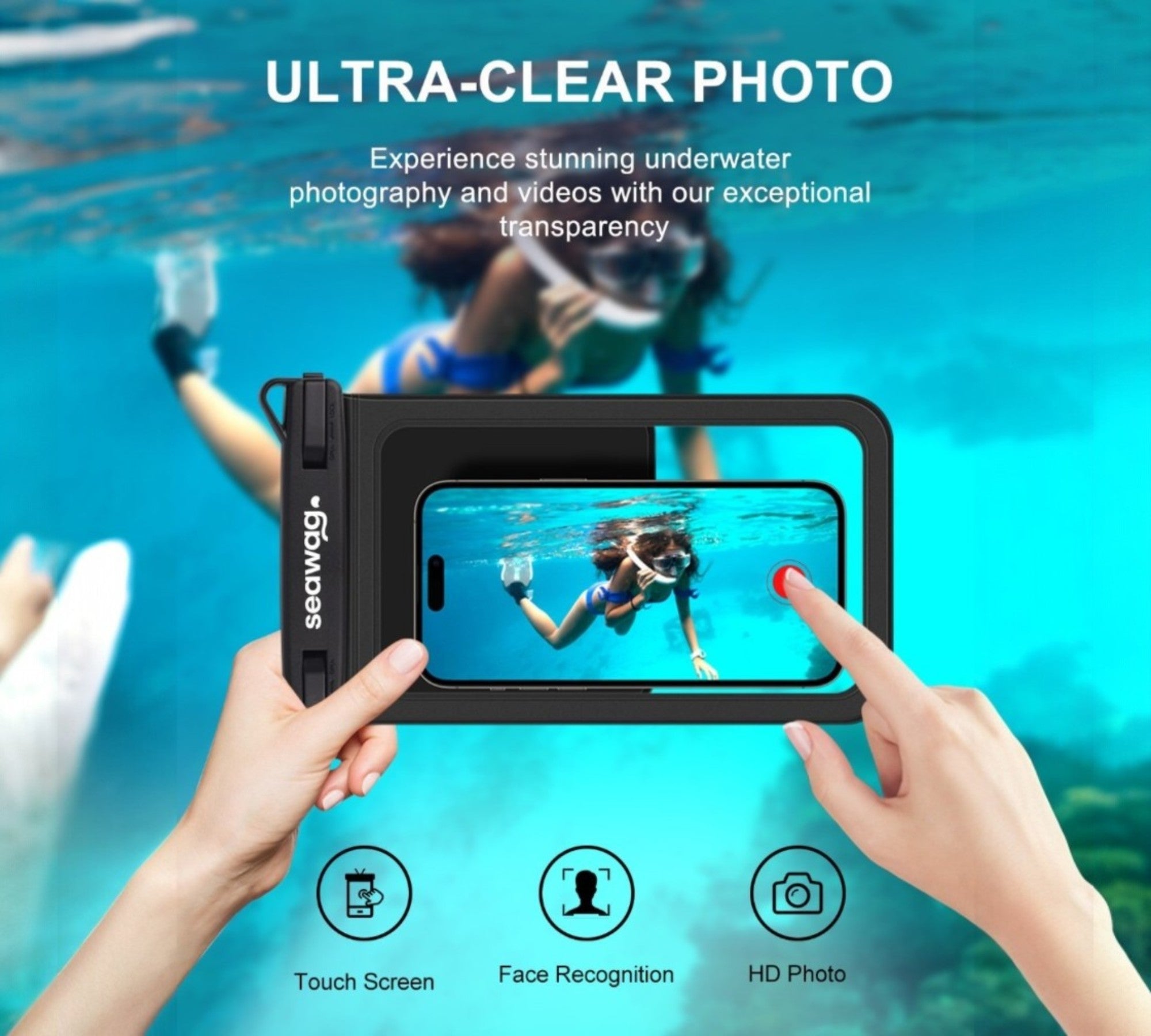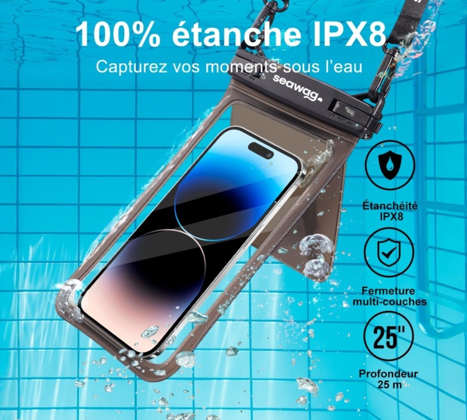 The Seawag PLUS waterproof smartphone pouch is designed with an ultra-transparent surface that guarantees excellent image quality. Capture your photos and videos with precision, even in wet conditions or underwater, without altering colors or sharpness.