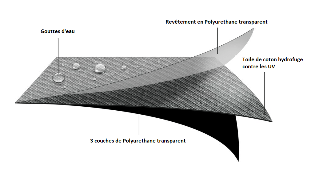 Cette toile imperméable est fabriquée à partir de fils de polyester ayant reçu un traitement particulier. On lui applique un revêtement en polyuréthane transparent pour garantir son étanchéité et sa solidité. Elle est 3x plus résistante qu'une toile en coton traditionnelle, résistante au UV et conserve malgré tout une grande souplesse.