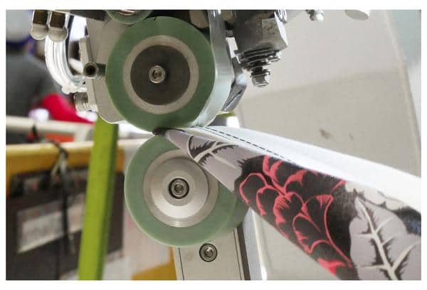 Au cours de ce processus, les éléments à assembler sont serrés entre deux matrices, et soumis à une tension à haute fréquence. La vibration des molécules crée de la chaleur, combinée à une forte pression, qui permet de fusionner les différents éléments de nos sacs.