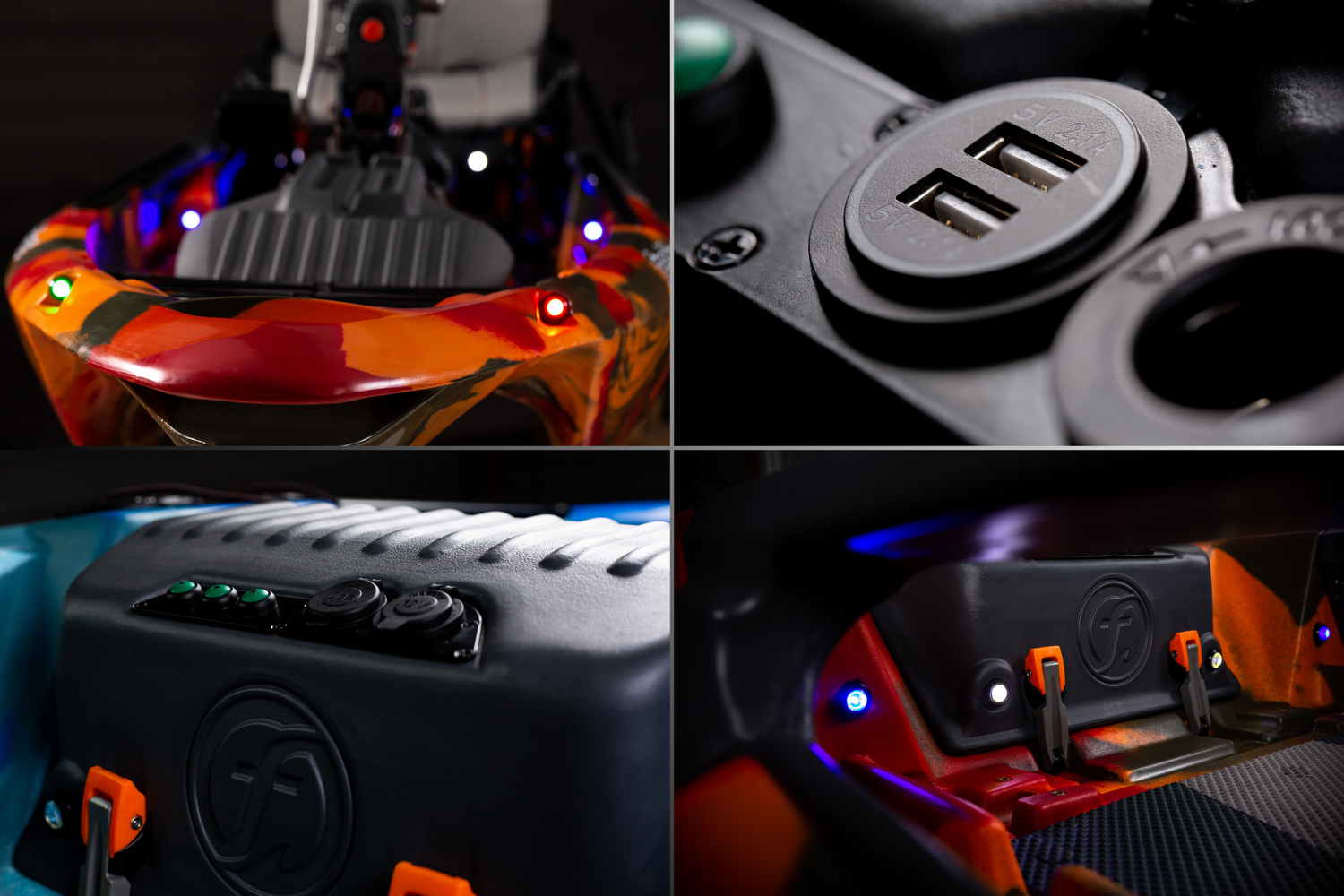Le Dorado intègre aussi les toutes dernières technologies de Feelfree : système de câblage électronique intégré, support de perche de transducteur repensé, trappe avant améliorée, nouveaux éclairages LED embarqués, poignées renforcées, et un boîtier de batterie amovible compatible 48v avec ports USB.